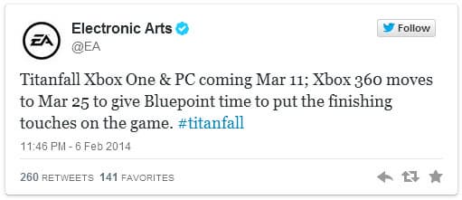 Компания Electronic Arts сообщила о том, что выход версии мультиплеерного шутера Titanfall для Xbox 360 был отложен на две недели, которые позволят разработчикам окончательно отполировать игру.
