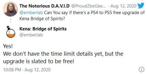 Студия Ember Lab подтвердила, что покупатели версии Kena: Bridge of Spirits для PS4 смогут бесплатно улучшить игру до издания для PlayStation 5. Разработчики отметили, что пока у них нет подробностей «о сроках бесплатного обновления». Похоже, улучшить Kena: Bridge of Spirits с версии для PS4 до версии для PS5 можно будет только в течение определённого времени.