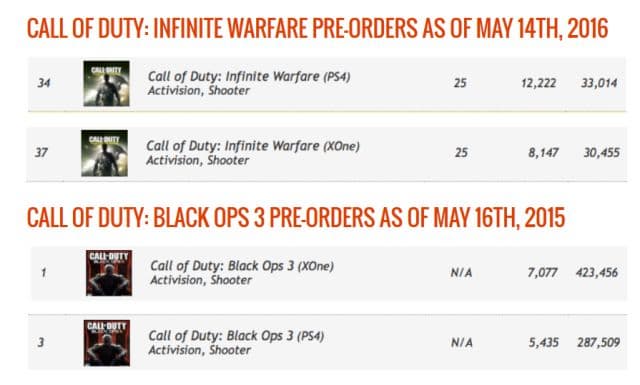 Как известно, пользователи встретили анонс и дебютный трейлер шутера Call of Duty: Infinite Warfare без особого энтузиазма. Не самый надежный ресурс VG Chartz уверяет, что игроки из США пока крайне неохотно оставляют предварительные заказы на Infinite Warfare.