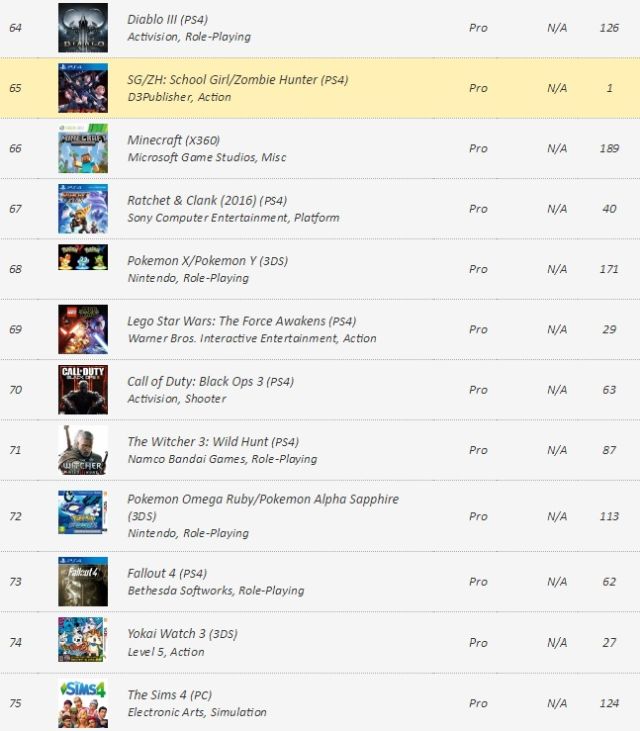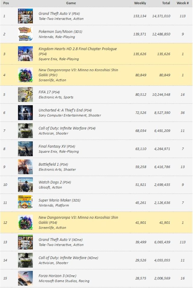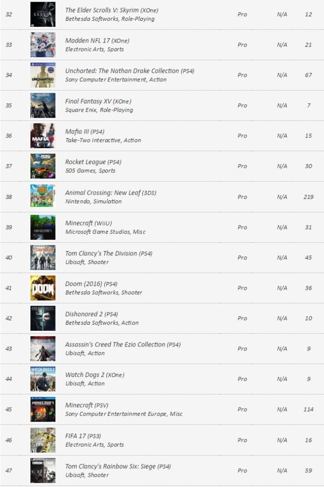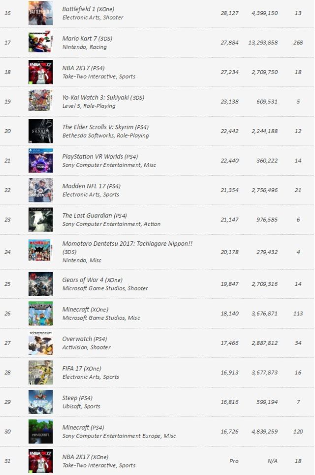 Самыми продаваемыми играми стали Grand Theft Auto V, Pokemon Moon/Sun, FIFA 17, Uncharted 4, Call of Duty: Infinite Warfare и Final Fantasy XV и другие.