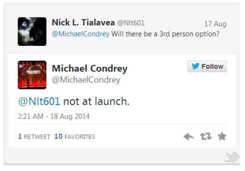 Отвечая на вопрос о виде от третьего лица в Call of Duty: Advanced Warfare, Майкл Кондри (Michael Condrey) заявил, что такового не будет в игре на момент релиза, позволив поклонникам надеяться на появления его в игре на более поздней стадии.