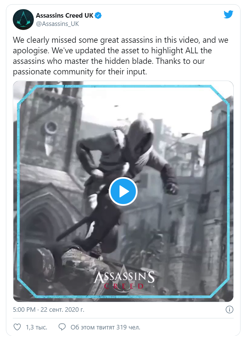 В преддверии скоро выпуска очередной части игрового сериала Assassin's Creed под названием Valhalla Ubisoft решила напомнить о себе и опубликовала рекламный ролик посвященный героям серии игр в Twitter своего подразделения в Великобритании, но пользователи видео не оценили.
