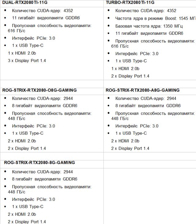 Компания ASUS представила игровые видеокарты серий ROG Strix, Turbo и Dual на базе графических процессоров GeForce RTX 2080 Ti и 2080. Видеокарты, в частности, поддерживают технологию трассировки лучей в реальном времени Nvidia RTX.