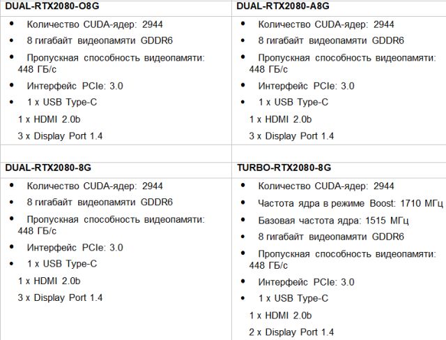 В моделях Strix GeForce RTX 2080 Ti и 2080 используются вентиляторы Axial-tech. Система охлаждения видеокарт ASUS Dual GeForce RTX 2080 Ti и 2080 основана на вентиляторах Wing-blade, ранее использовавшихся только в серии ROG Strix. Модели ASUS Turbo GeForce RTX 2080 Ti и 2080 предназначены для многопроцессорных графических конфигураций и сценариев использования с ограниченной вентиляцией.