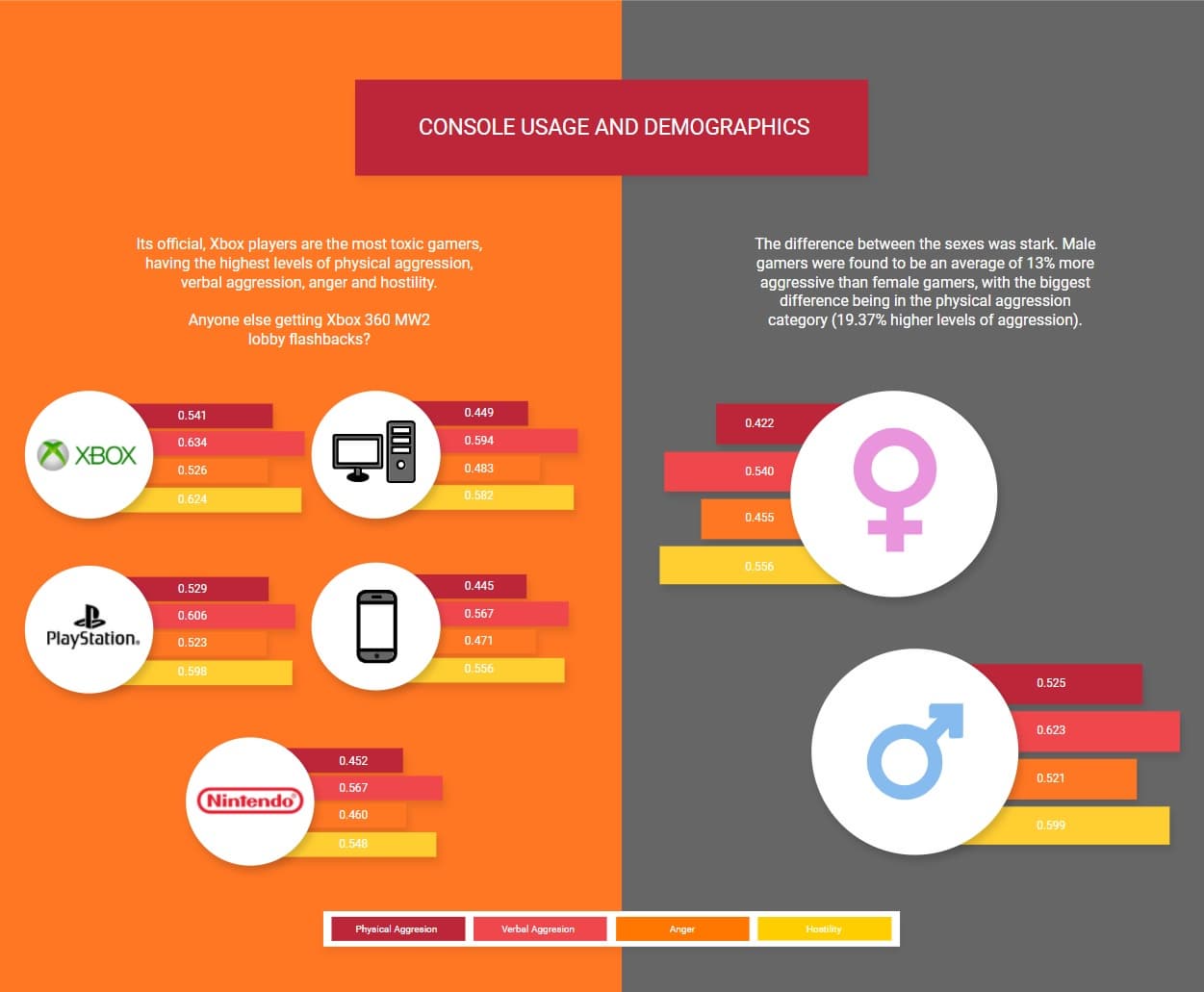 Согласно исследованию, самые агрессивные игроки – владельцы консоли Microsoft. Именно они чаще всего используют ненормативную лексику и впадают в ярость, проявляют физическую агрессию и неприязнь к другим игрокам. На втором месте владельцы PlayStation. За ними следуют пользователи PC и мобильных платформ. Наименее конфликтными являются покупатели консоли Nintendo Switch.