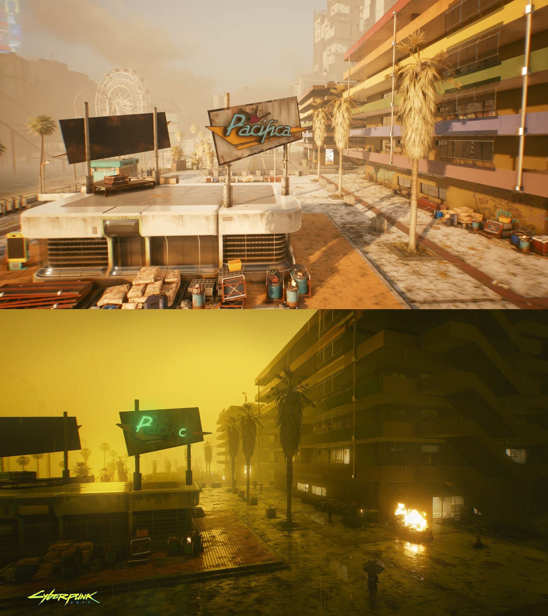 Пользователь Reddit под ником xollextor обнаружил, что в разработчики Cyberpunk 2077 в различных материалах показали один и тот же вид мегаполиса Найт-Сити, но с другими погодными условиями. В одном случае нам демонстрируют яркий солнечный день, а в другом – дождливый вечер. Можно оценить, как погода влияет на восприятие декораций в игре.