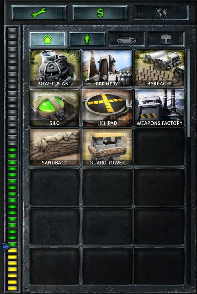 «Однако с учётом правил очереди строительства в оригинальных играх мы хотели, чтобы все здания находились в одной вкладке и с ней были бы связаны вкладки для пехоты, транспортных средств (воздух, земля, флот) и поддержки. С целью сократить прокрутку мы разработали боковую панель с 18 кнопками для строительства», - отметил Весселла.