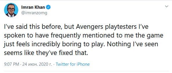 «Плейтестеры Marvel's Avengers, с которыми я общался, часто говорили мене, что игра ощущается невероятно скучной. В увиденных мною материалах нет свидетельств о том, что они исправили проблемы», - отметил Имран Хан.