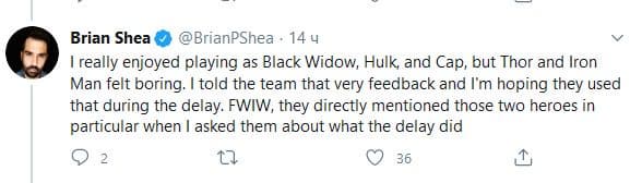 Впрочем, нынешний редактор Game Informer Брайан Ши отметил, что ему понравилось играть за Чёрную Вдову, Халка и Капитана Америку, а вот игра за Тора и Железного Человека не радовала. Брайан отметил, что разработчики упоминали Тора и Железного Человека, когда говорили о переносе релиза игры с мая на сентябрь этого года. Брайан Ши заявил, что разработчики слушают отзывы о проекте, и надеется на то, что перенос релиза позитивно повлияет на игру.