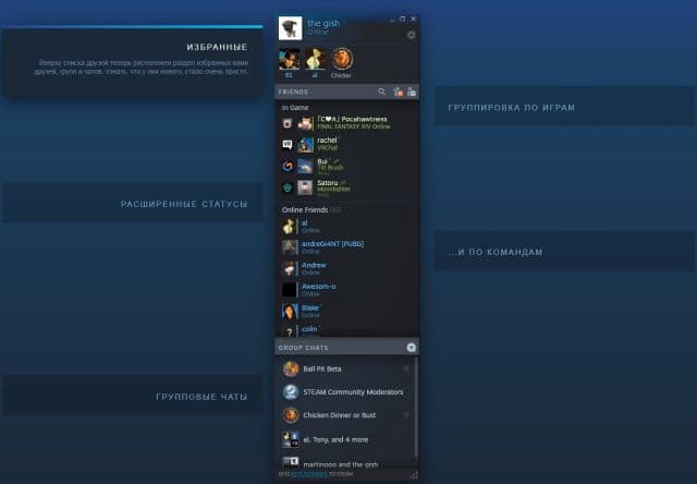 - Настройки списка друзей. Приятелей по игре можно добавлять в избранное, группировать по играм и командам, определять статус в текущий момент, проводить групповые чаты.