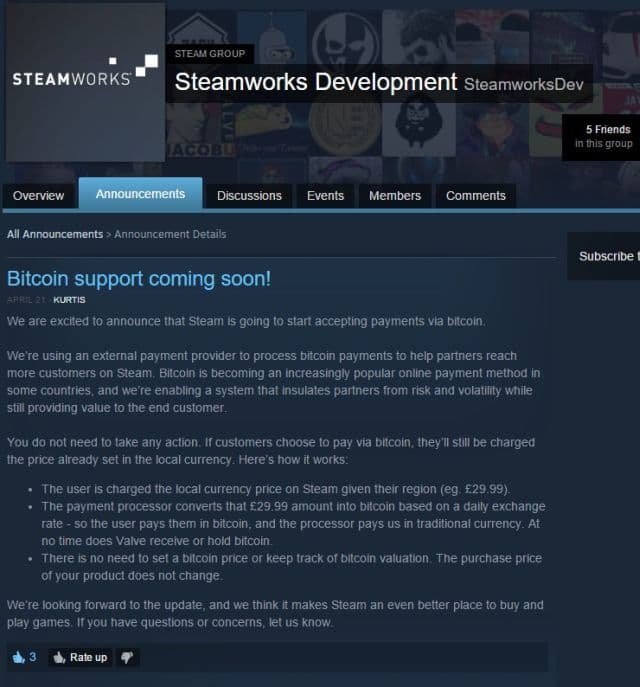 Не исключено, что в скором времени в сервисе Steam можно будет приобрести игры, в том числе, за биткоины. Об этом, как уверяет ресурс PCGamesN, компания Valve сообщила разработчикам на закрытом для посторонних форуме. Но информация просочилось в сеть.