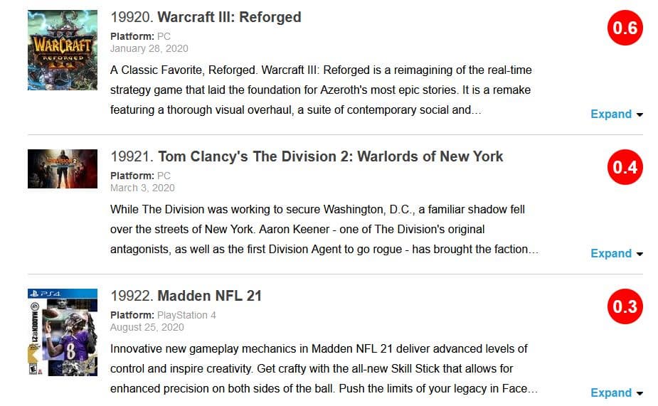 Раздосадованные игроки выплеснули негодование на сайте Metacritic. PS4-версия Madden NFL 21 стала самой низко оценённой игрой в истории Metacritic по версии пользователей. Сейчас пользовательский рейтинг проекта равняется 0,3/10 (1733 оценки). Madden NFL 21 находится ниже РС-версии дополнения The Division 2: Warlords of New York (0,4/10) и ниже Warcraft 3: Reforged (0,6/10).