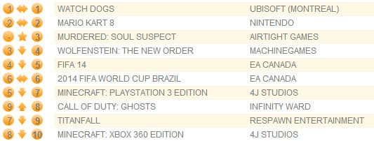 Приключенческой экшен Watch Dogs остается лидером, второе место вновь заняли аркадные гонки Mario Kart 8. Новый детективный триллер Murdered: Soul Suspect стартовал на третьей строчке, новая многопользовательская онлайновая игра Wildstar стартовала на 14-й строчке.