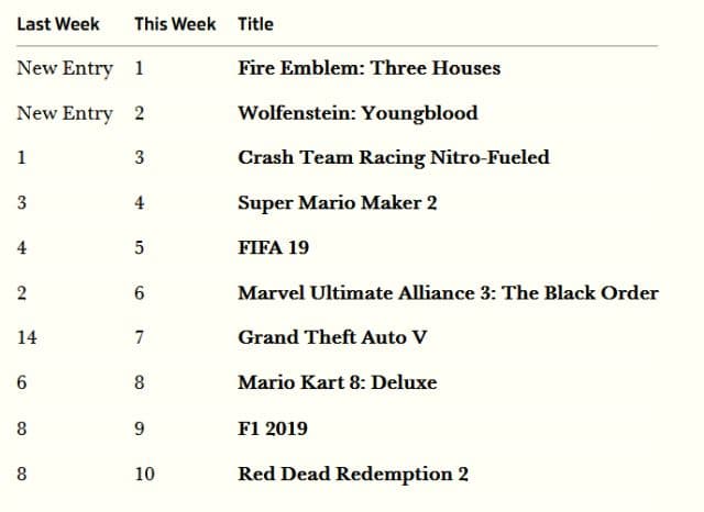 На первом месте стартовала пошаговая тактика Fire Emblem: Three Houses для Switch. Продажи игры за первую неделю оказались выше, чем общие продажи обеих изданий Fire Emblem Fates (Conquest и Birthright) для 3DS, и выше стартовых продаж Fire Emblem: Awakening для 3DS. Three Houses стартовала примерно в 15 раз лучше чем Fire Emblem: Radiant Dawn для Wii.