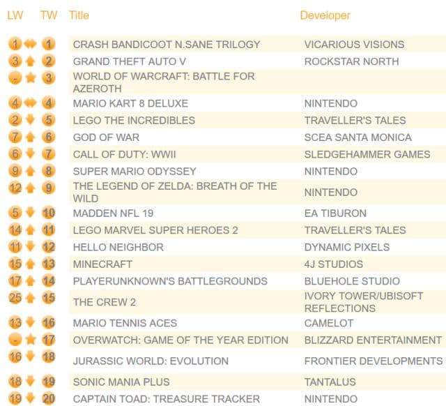 Появились данные о продажах дисковых версий игр на территории Британии за прошлую неделю. Первое место вот уже восьмую неделю подряд удерживает сборник Crash Bandicoot: N.Sane Trilogy. С третьего на второе место поднялся проект Grand Theft Auto V.