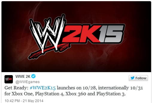На официальной twitter-страничке игровой серии WWE 2K была опубликовала информация о том, что поступление в продажу нового симулятора рестлинга WWE 2K15 состоится 25 октября в США и 28 октября в Европе.