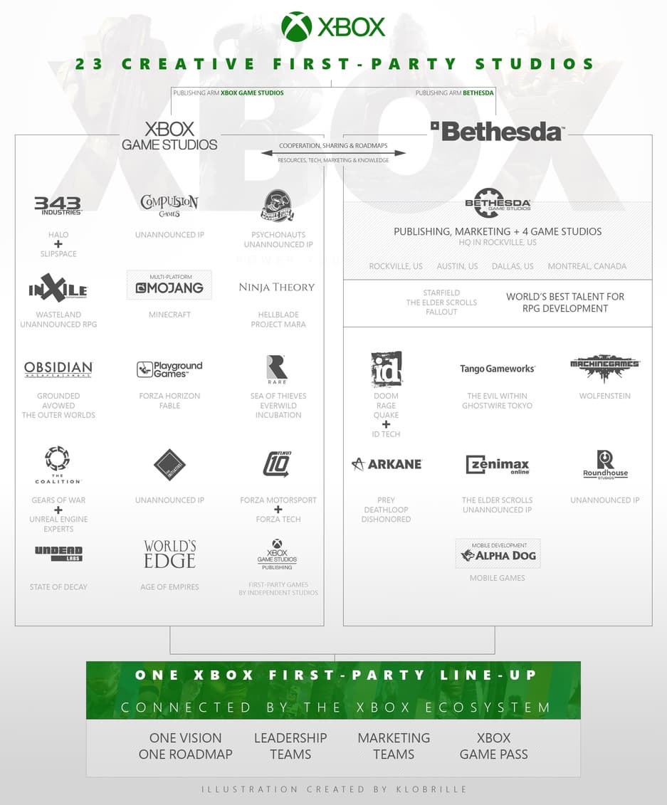 Информатор бренда Xbox с ником Klobrille показал инфографику, которая представляет структуру Microsoft – Xbox Game Studios будет сотрудничать с Bethesda, использовать один список премьер, обмениваться ресурсами, технологиями и знаниями, но у обеих организаций будут отдельные издательства. Это связано с тем, что Xbox Game Studio одномоментно не может самостоятельно управлять дополнительными 8 командами. Bethesda пока будет в некоторой степени независимой командой, но получит помощь от Microsoft.