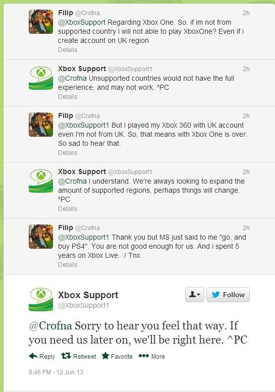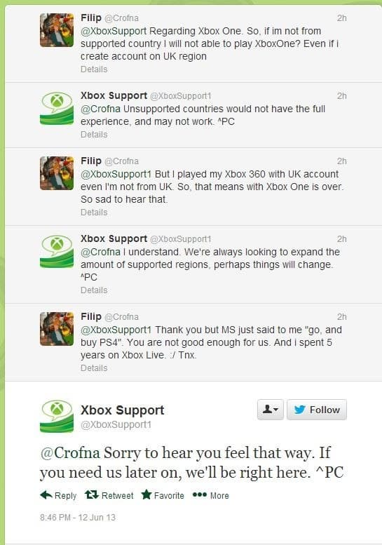 Человек задает вопрос, будет ли работать Xbox One в стране, где не запущен Xbox Live, если он зарегистрирует аккаунт, например, в Соединенном Королевстве, как он делал это для Xbox 360. Представитель службы поддержки заявил, что в неподдерживаемых странах пользовательский опыт будет ограниченным, более того, консоль может просто не работать (конкретики пока нет). Он также добавил, что в будущем ситуация может измениться, а список стран - расшириться.