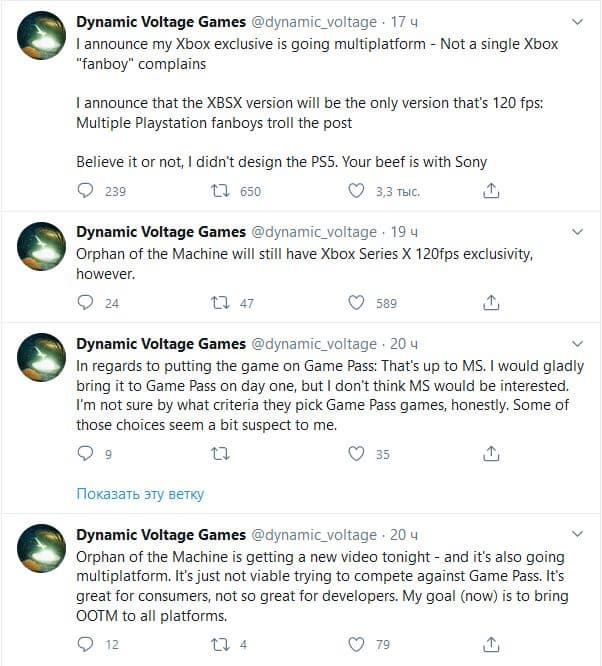 «Я сообщаю о том, что мой Xbox-эксклюзив станет мультиплатформой – ни один “фанбой” Xbox не жалуется. Я сообщаю, что только в версии Xbox Series X будет 120к/c – много фанбоев Playstation троллят моё заявление. Хочешь верь, хочешь нет, но не я создавал PS5. Вам надо жаловаться Sony», - написал разработчик в твиттере.