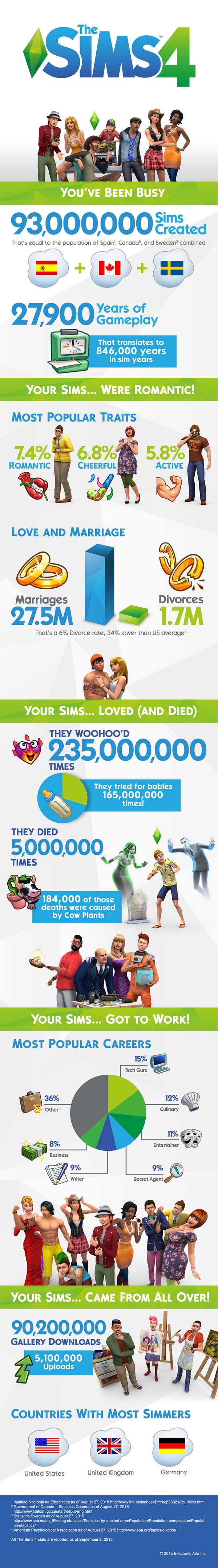 Фанаты создали более 93 млн симов, столько же человек населяет Канаду, Испанию и Швецию, вместе взятые. 5 млн симов умерли по различным причинам. За игрой поклонники провели суммарно более 27 тыс. лет, создали 27,5 млн брачных союзов, из которых развалились 1,7 млн.