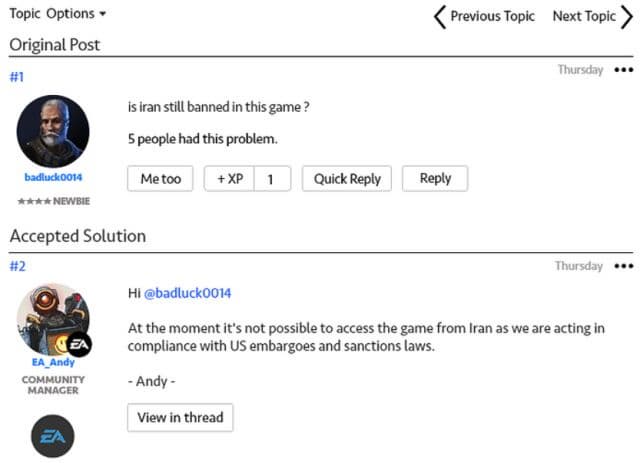 Один из пользователей поинтересовался на форуме Anthem о том, почему игроки из Ирана не могут получить доступ к проекту.