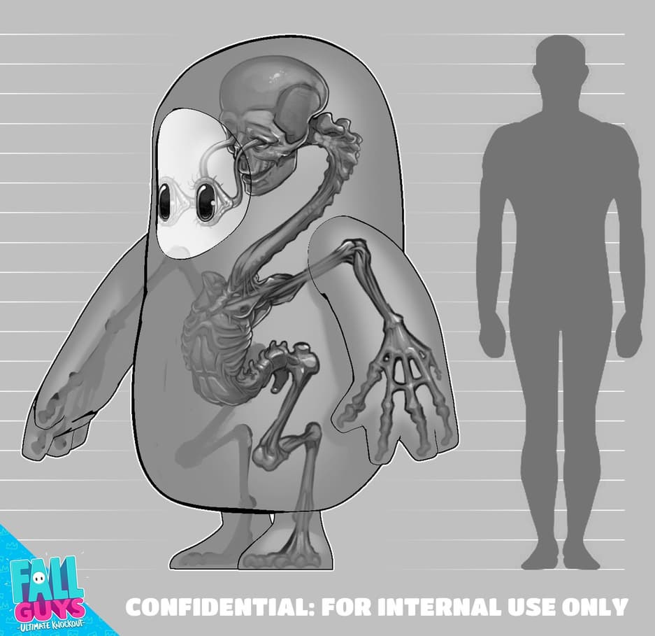 Старший концепт-художник чрезвычайно успешного проекта Fall Guys Тюдор Моррис опубликовал изображения, на которых показал внутреннее строение персонажей игры. Персонажи Fall Guys внешне ничем особо непримечательны, но индивидуальности им предают разнообразные костюмы. Тюдор Моррис представил, как выглядит скелет этих созданий. Прилагаются жутковатые на вид глаза. Согласно официальной информации, высота персонажа Fall Guys равняется 183 сантиметра.