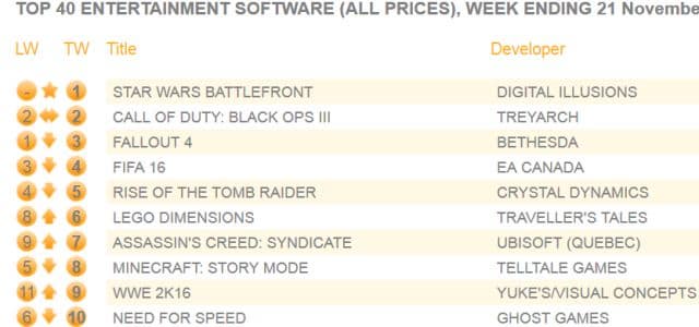 Новым лидером стал сетевой шутер Star Wars Battlefront. Это самый успешный старт среди всех игр по мотивам «Звёздных войн» и 4-й старт среди всех игр, выпущенных в этом году. В течение первой недели Battlefront продался на 117% лучше, чем Star Wars: The Force Unleashed за аналогичный период. Поскольку игра официально считается «перезагрузкой» серии, это самая быстро распродаваемая игра для PS4, которая не является прямым сиквелом в каком-либо сериале.