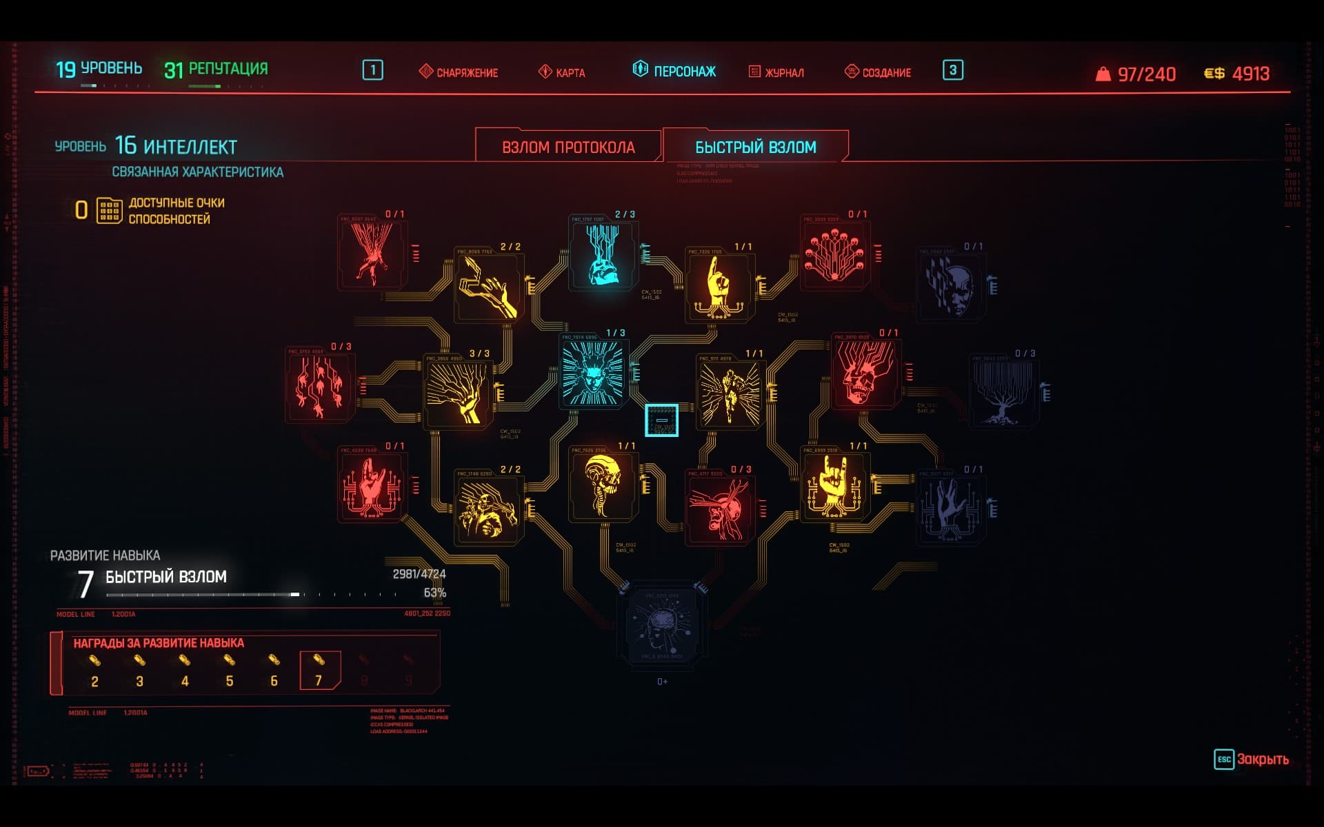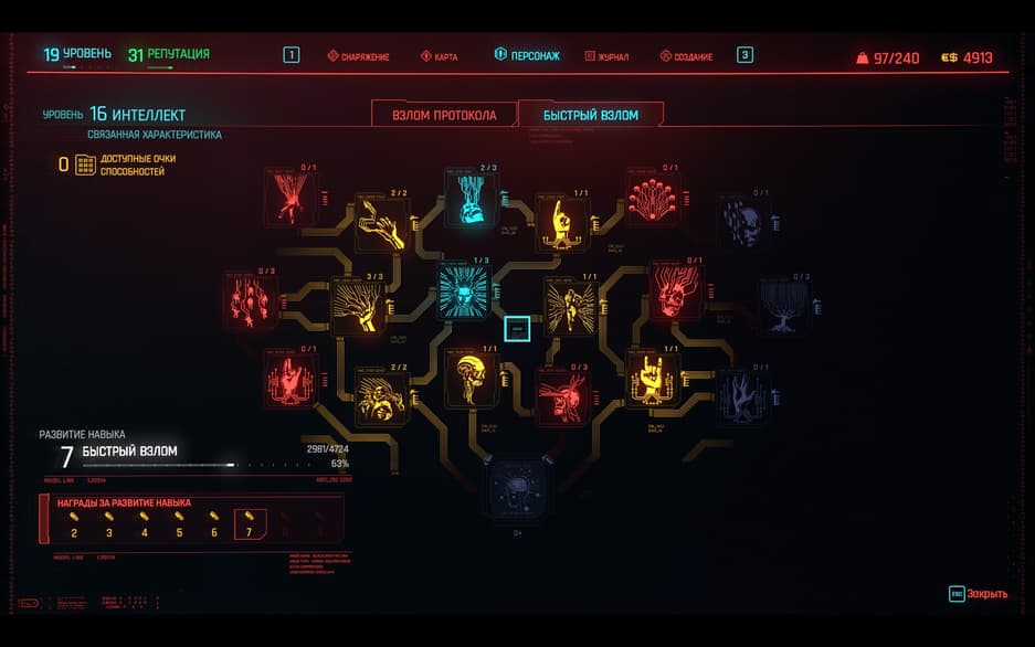 К сожалению, активных навыков в ветке прокачки в игре не так много. У «нетраннера» это взлом всевозможной вражеской техники с расстояния и создание новых «вирусов» и их использование с помощью кибердеки, а также увеличение урона или ячеек памяти. А вот с огнестрельным оружием всё куда хуже. Из активных талантов можно выделить замедление времени, когда персонаж одновременно уклоняется от пуль и ведёт бой с помощью пистолетов или винтовок (да, данный навык можно прокачать только в ветке «Реакция»). Но присутствует и множество полезных пассивных перков, вроде увеличения урона во время стрельбы из-за укрытия.