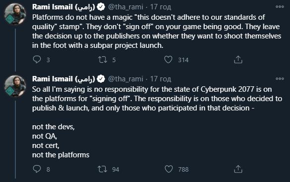 Вся вина за работу игры ложится на издателя, только он решает, выпускать ли проект или нет, отменять ли его выход после сертификации или продавать в неготовом виде. Здесь стоит понимать одно – ни платформодержатель, ни разработчик не виноваты в произошедшем. Вся ответственность лежит на холдинге CD Projekt, который и отправлял незавершённый продукт на сертификацию и решил выпустить его на консолях прошлого поколения для увеличения прибыли, соврав о том, что "Киберпанк работает как нужно".