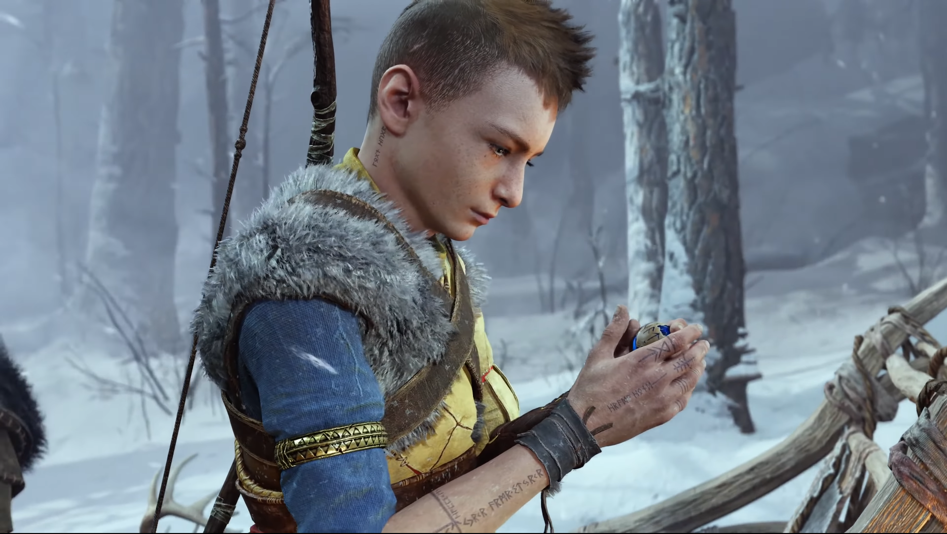 Именно во время Фимбулвинтера и происходят события Ragnarok. И, судя по словам разработчиков, прошло уже несколько лет. Мы можем увидеть повзрослевшего Атрея и слегка постаревшего, более спокойного Кратоса. Первая открывающая сцена показывает нам не только внешние метаморфозы героев, но и внутренние. Сын сам отправился на охоту и убил оленя (хотя в первой части это было для него проблемой), а отец сидит в пещере у костра, облачённый в тёплые одежды, и делает стрелы для Локи. Если это начальные сцены игры, мы можем предположить, что Кратос проверял умения сына – Атрей улыбается, когда укладывает тушу оленя на землю. Об этом также говорит одобрительная реакция бога войны – Кратос немногословен и не изменяет себе, но это можно понять по выражению его лица и удивлённому комментарию: «Хм!».