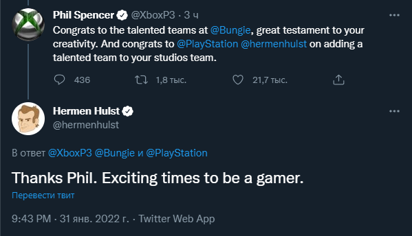 Это стратегический шаг к развитию игрового опыта, который мы создаём. Опыт студии Bungie в работе с сообществом неоспорим – он будет способствовать разработке нескольких будущих сервисов PlayStation Studios. Мы видим, насколько исключительны навыки PlayStation Studios, а потому это поможет и в расширении будущего портфолио технологий Bungie.»
