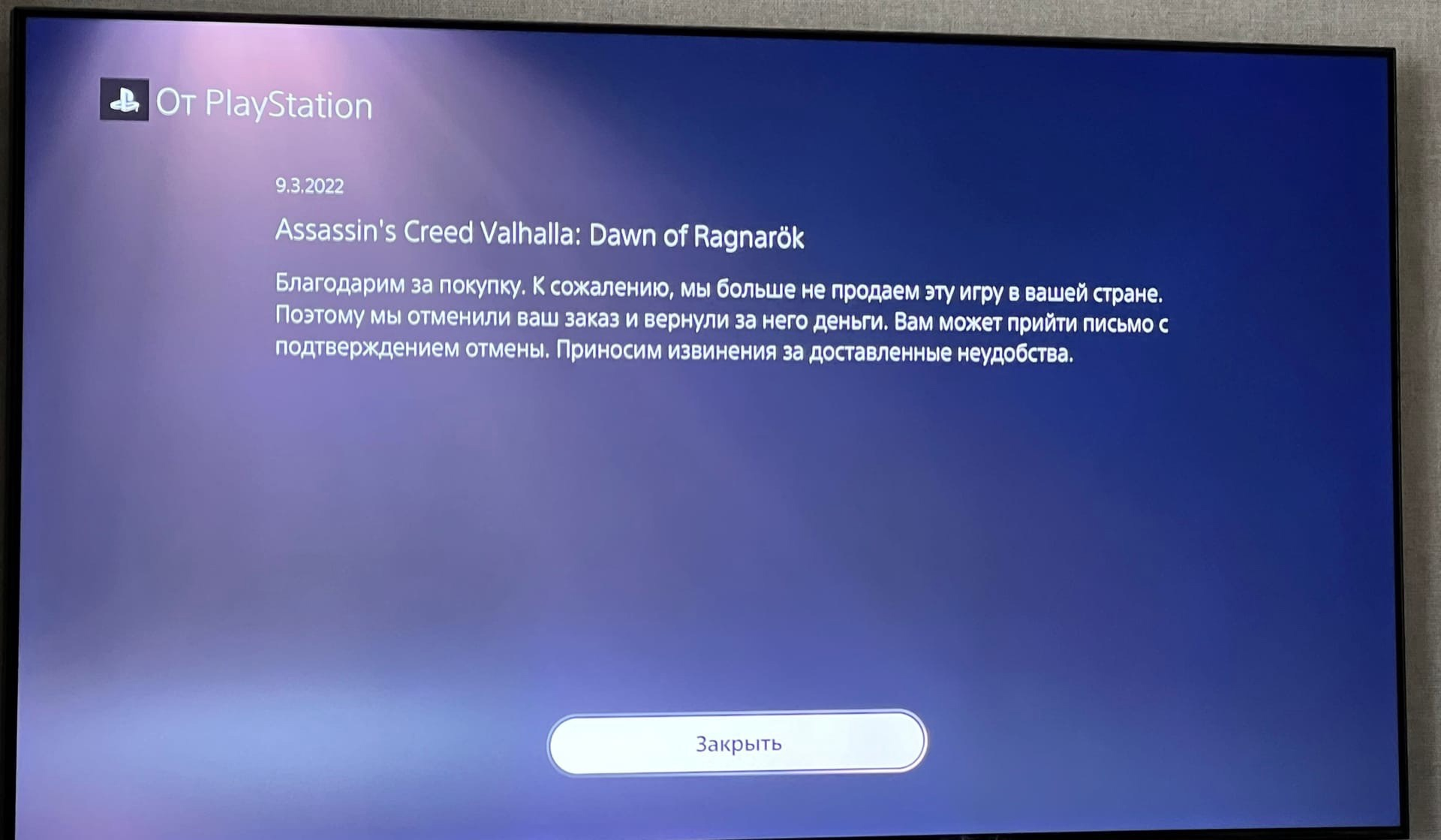 Что это значит? Невозможность зайти в PlayStation Store и совершать покупки. Более того – даже активация некоторого дополнительного контента с физических носителей запрещена. Так, под раздачу попало дополнение для Assassin's Creed Valhalla – «Заря Рагнарёка». Издатель Ubisoft не рекомендовал покупать его на дисках у крупных ритейлеров, ведь активировать его у игроков попросту не выйдет. Ниже - скриншот, который приветствовал игроков после покупки цифровой версии Dawn of Ragnarok.