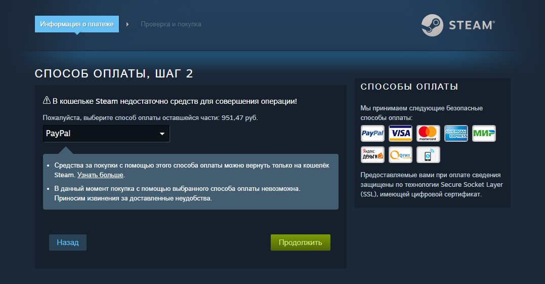 В начале марта Steam перестал принимать любые возможные платежи, кроме PayPal и кошелька Steam. Присутствовало множество способов пополнения и покупки игр в магазине, однако они неактуальны на данный момент. Всё потому, что даже покупка игр с помощью кошелька в сервисе Steam оказалась запрещена «по решению США». Да, Valve в этом вопросе оказалась на стороне уходящих из РФ и Беларуси издателей – пусть и не самостоятельно.