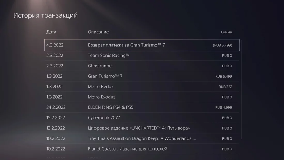 Первым странным шагом Sony был возврат денег за Gran Turismo 7 всем игрокам, которые предзаказали проект в цифровом виде. 4 марта, в 00:00 часов по московскому времени, игра стала доступна всем, а некоторые даже успели поиграть в любимый автосимулятор. Однако включив консоль утром, пользователи обнаружили, что на Gran Turismo 7 висит «замок», запрещающий запускать проект. В истории транзакций появился пункт «Возврат платежа за Gran Turismo 7». Связывать данное решение можно с невозможностью Sony получить деньги – уже тогда банковские системы начали предпринимать всевозможные попытки уйти с рынка РФ и Беларуси.