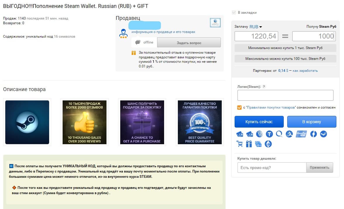 По запросу «Пополнение счёта Steam» можно увидеть целый список продавцов. Стоит выбирать только тех, у кого большой рейтинг и возможность пополнения от нужной вам минимальной суммы. Что это значит? Некоторые продавцы предлагают пополнить кошелёк от 1000 рублей и выше, а некоторые – от 100 рублей.