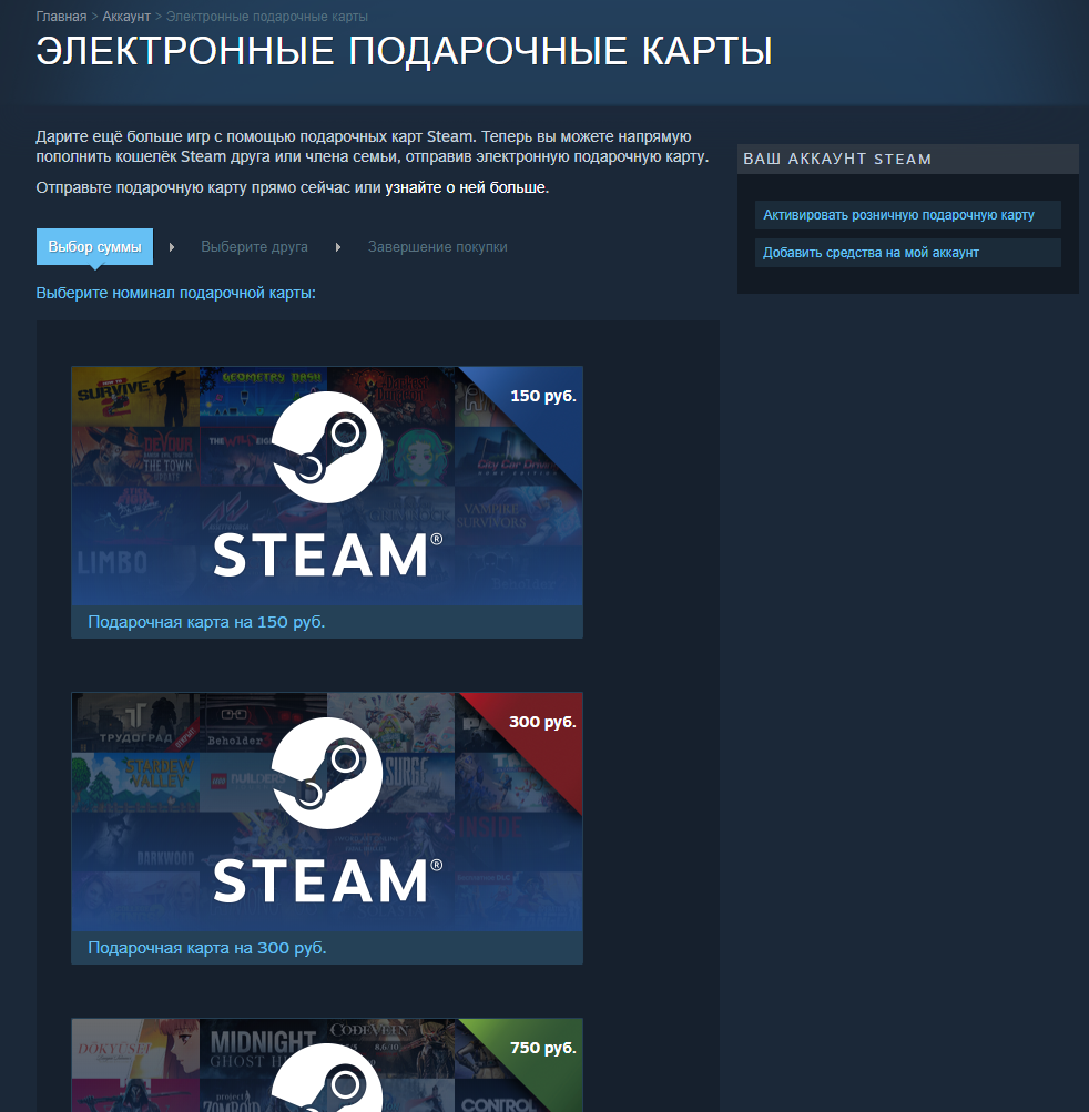 Сделать это можно здесь или на главной странице магазина Steam — прямо над тегами жанров. Номиналы есть разные от 150 до 3000 рублей. Дарить их можно в разные страны без ограничений.