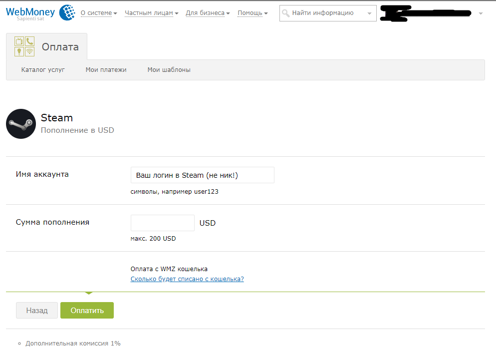 - После того как кошелёк пополнен, необходимо перейти во вкладку «Оплата» и в поиске написать «Steam». Для удобства сразу даём ссылку на услугу Здесь необходимо ввести имя вашего Steam-аккаунта — логин, который используется при входе — и сумму пополнения. Webmoney берёт комиссию с пополнения, поэтому предварительно убедитесь, сколько денег спишется с WMZ-кошелька, нажав на кнопку «Сколько будет списано?» чуть ниже основных полей с информацией.