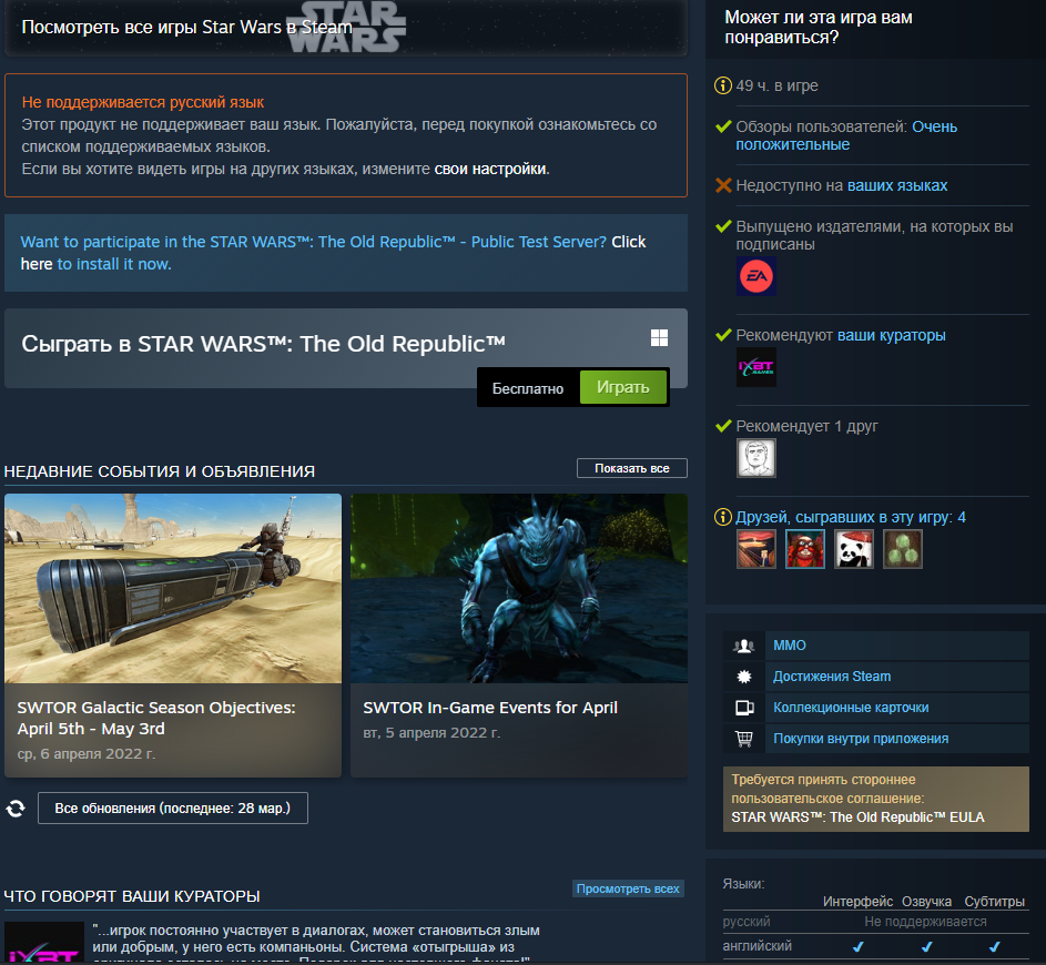 Steam по-прежнему позволяет скачивать и играть во free-to-play проекты, но вот с покупкой внутриигровых средств, не привязанных к Steam, могут возникнуть проблемы. Некоторые издатели и вовсе убрали свои подписки на MMO-проекты или дополнения из продажи. Например, Electronic Arts позволяет установить и играть в свою Star Wars: The Old Republic через Steam, но купить подписку больше нельзя — на странице в магазине данная возможность отсутствует.