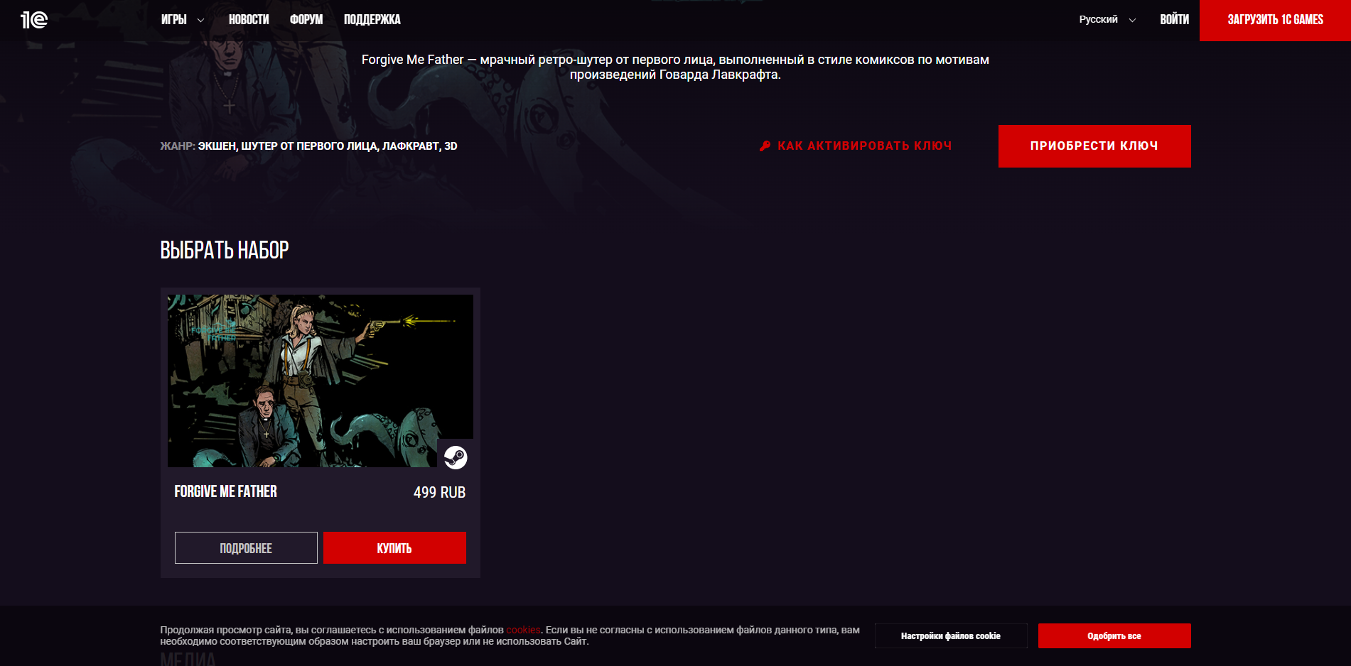 - 1C-Games — на сайте представлены все игры издателя 1C, но не для всех можно купить ключи. Например, King's Bounty 2 приобрести нельзя — стоит ссылка на сайт игры. Всё потому что хоть разработчиком и значится 1C Games, но издатель у игры компания Prime Matter — она покинула Россию. А вот новенькая Forgive Me Father в продаже на сайте присутствует.