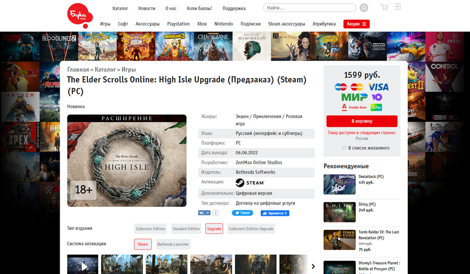 - Магазин «Бука» — в каталоге издателя можно найти много чего для Steam, но придётся именно что искать. В каталоге очень много инди-игр и маленьких казуальных игр, но это не значит, что хороших и крупных проектов там нет. Нам даже удалось отыскать предзаказ грядущего дополнения The Elder Scrolls Online: High Isle.