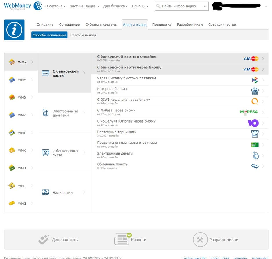 - Пополнить WMZ-кошелёк можно множеством способов. В нашем случае это будет банковская карта. Заходим в пункт «Ввод и вывод», подпункт «Способы пополнения». Выбираем способ «С банковской карты в онлайне».