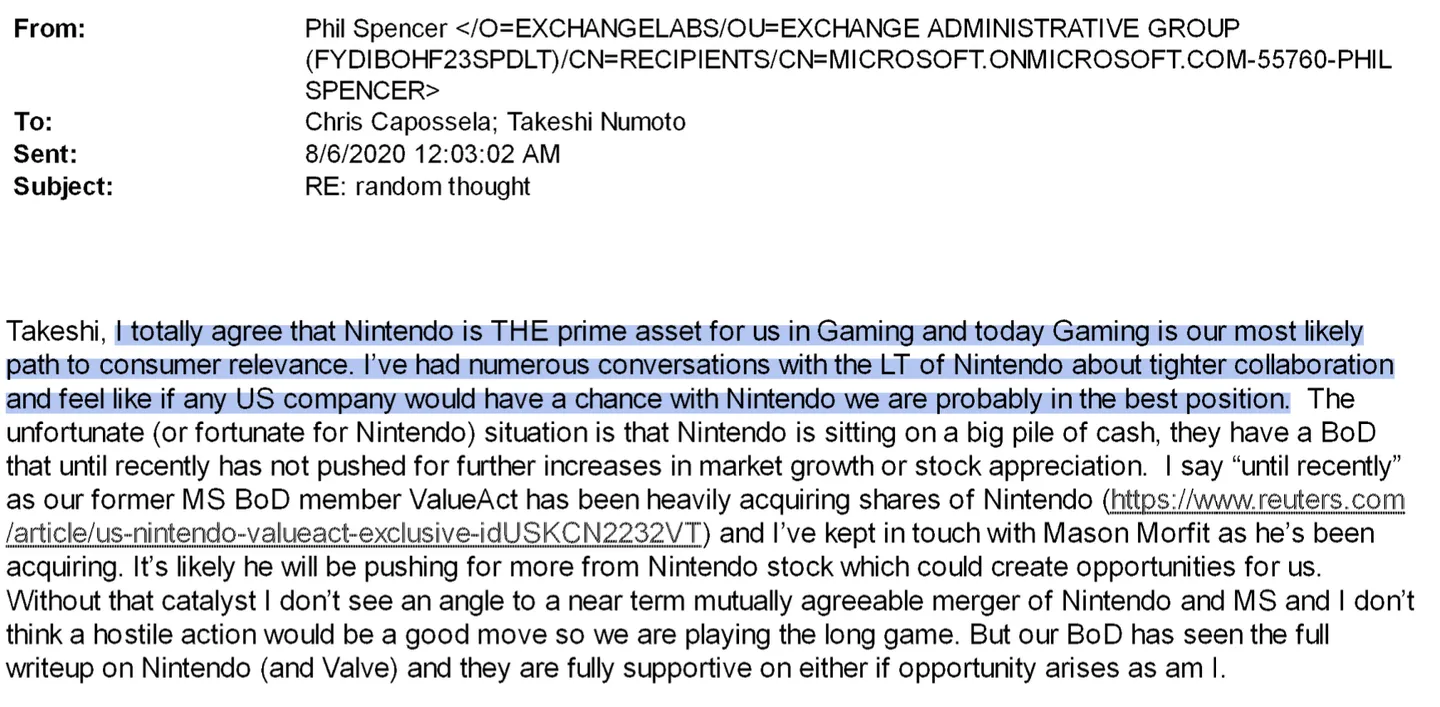 Из служебных переписок выяснилось, что Фил Спенсер предлагал поглотить Valve или Nintendo. Глава Xbox заявил, что Microsoft для подобного приобретения Nintendo нужен какой-нибудь «катализатор», без которого «недружественное поглощение будет плохим ходом». Планы нацелены на долгосрочную перспективу: «до Nintendo долго доходит, что у неё может быть будущее за пределами своих игровых устройств». Совет директоров Microsoft поддерживает подобный ход.