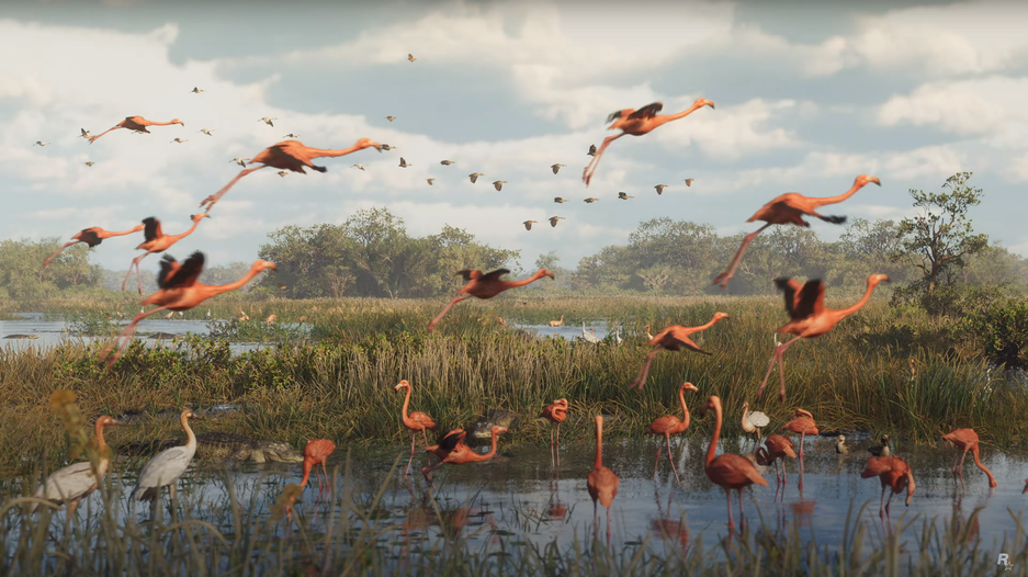 Будет дикая природа, как и заявляли сливщики и собиратели карты Grand Theft Auto VI до появления трейлера — следующие кадры показывают флоридские болота-заводи байю, стаи фламинго, крокодилов на них охотящихся, а также густую растительность вокруг.