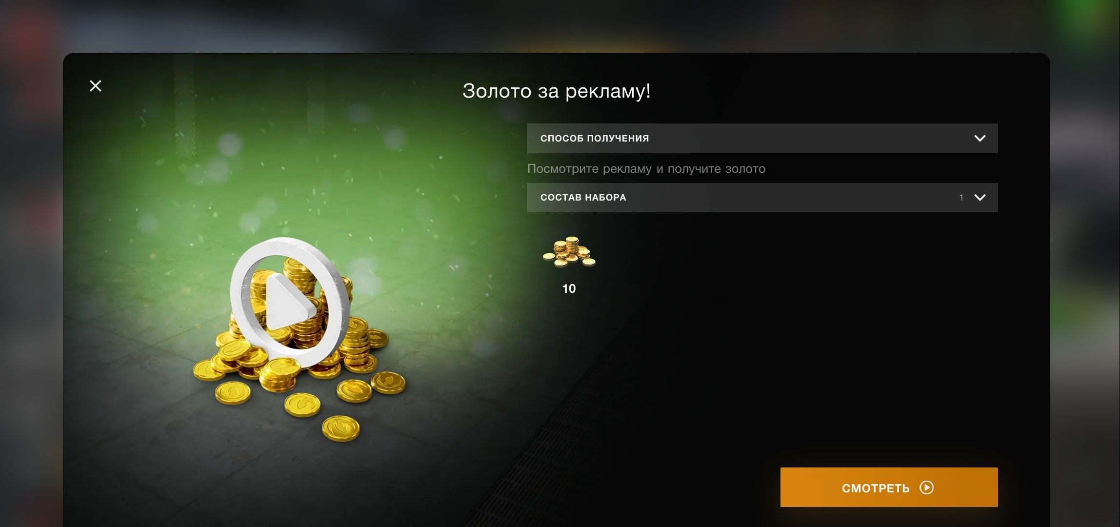 Например, в игре Tanks Blitz — младшей версии Мира Танков — помимо обычных кейсов, которые открываются с течением времени, присутствует и специальный видеоконтейнер. Чтобы его открыть, нужно просмотреть рекламный ролик, а в качестве награды можно получить золотые танки и премиум валюту. Также там можно до 5 раз в день забирать по 10 золотых монет за просмотр рекламы.