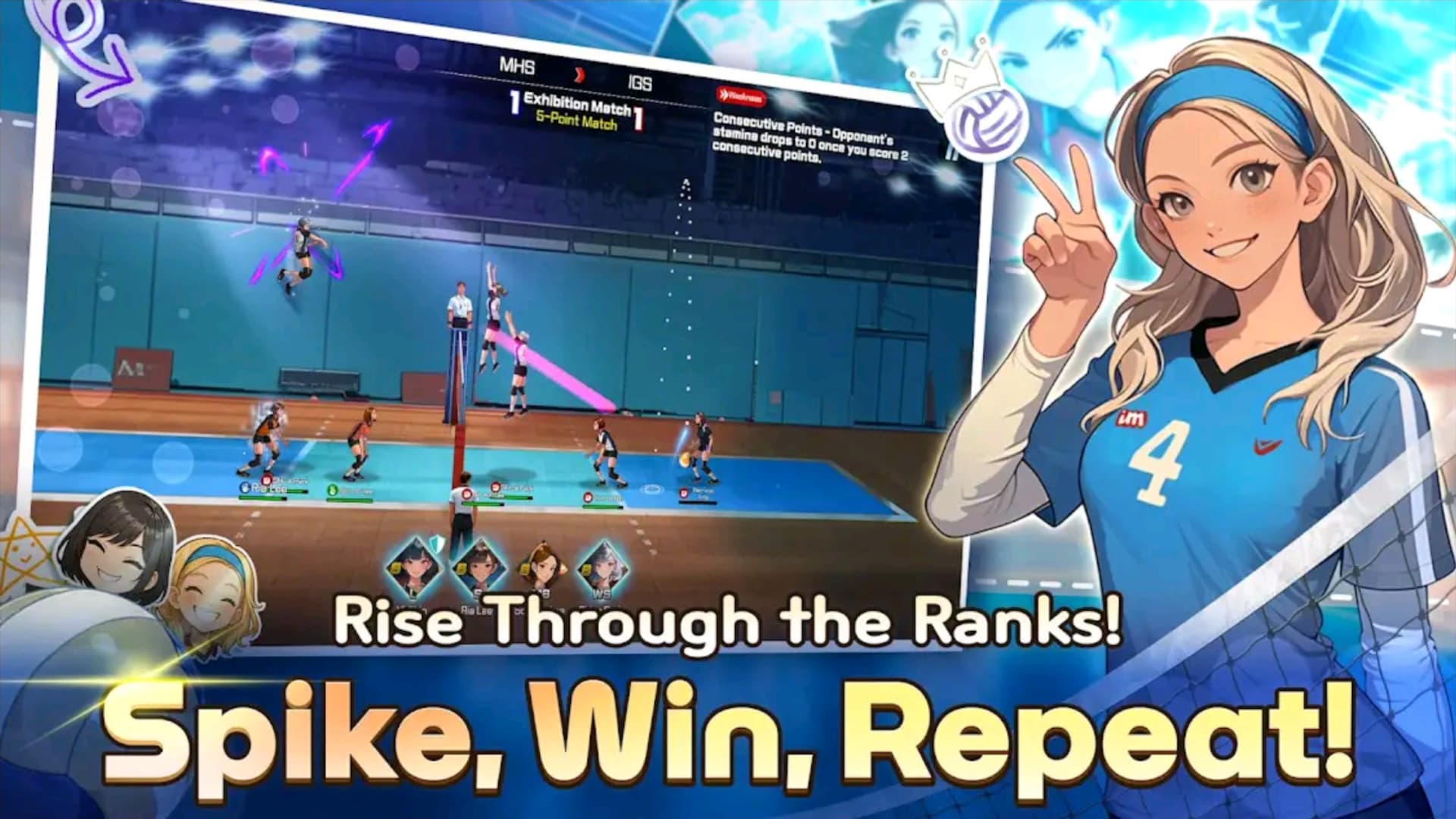 И да, игра использует гача-механику. Здесь она работает как в классических карточных играх: покупаешь бустер — и кто попадёт в команду, решает удача. Хотите сильную подающую? Ловите шанс. А игра тут — почти настоящий волейбол. На смартфоне. С 4 на 4, с подачами в прыжке, блоками, замысловатыми розыгрышами и даже комментаторами, которые кричат от восторга при удачном блоке. Это же реально круто!