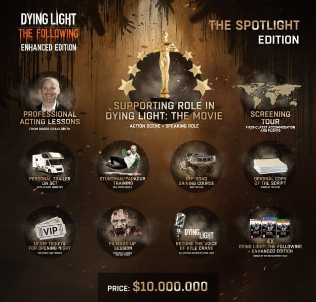 Что оно содержало? Четыре копии игры с подписями создателей, роль второго плана в фильме Dying Light: The Movie (о нём до сих пор ничего не слышно), курсы актёрского мастерства, тур по местам съёмок, собственный трейлер на съёмочной площадке, курсы внедорожного вождения, обучение трюкам и паркуру, сеансы макияжа, а также оригинальную копию сценария фильма, 10 VIP-билетов на премьеру и возможность стать голосом одного из персонажей игры.