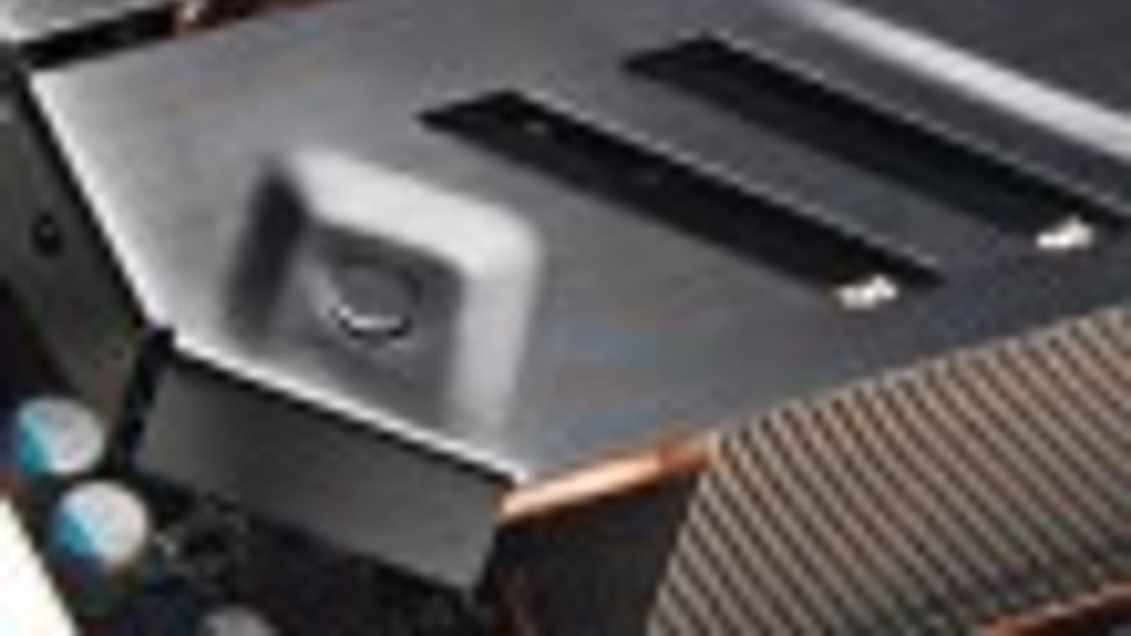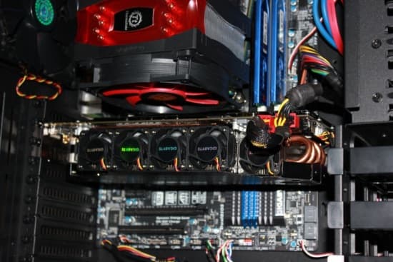 Затем, чтобы рассказать уже о реализации адаптера производителем, слово взял представитель Gigabyte. Видеокарта GV-N680SO-2GD получила целых пять вентиляторов и крупную испарительную камеру, закрывающую все основные элементы. Несмотря на столь солидную систему охлаждения, утверждается, что при этом, благодаря оптимизации воздухопотоков, продукт Gigabyte при максимальной нагрузке производит почти в два раза меньше шума, чем референсная плата NVIDIA.