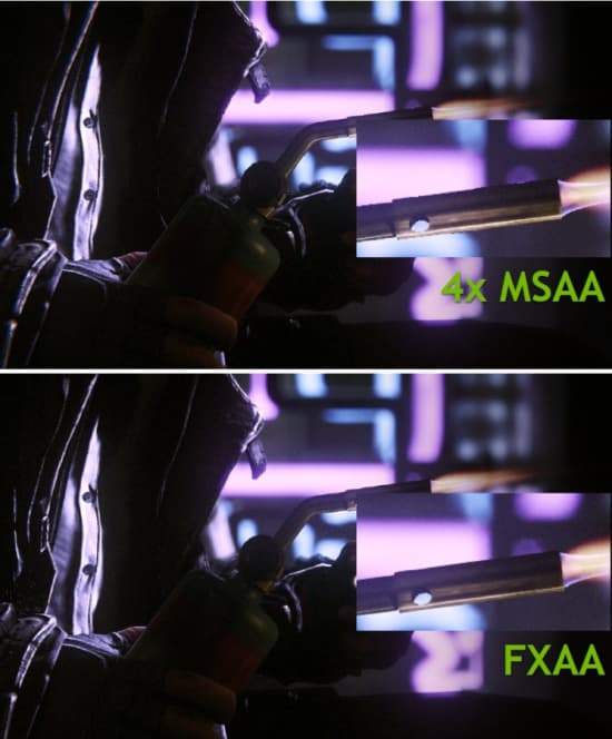 Второй, более интересной технологией, является FXAA — разработанный NVIDIA алгоритм сглаживания. По заявлениям компании, он потребляет на 60% меньше ресурсов системы, чем 4x MSAA и при этом представляет гораздо более гладкую картинку. В новых версиях драйверов NVIDIA технология FXAA поддерживается уже начиная с трехсотой серии. К сожалению, список игр, где она реализована, пока невелик — «более 15» — но пользователь может включить форсированное использование FXAA через контрольную панель.