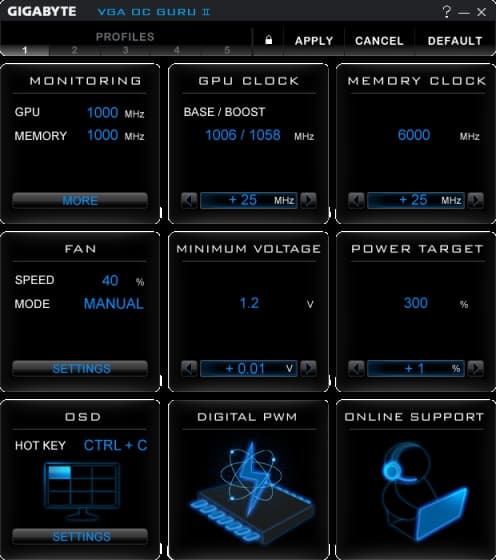 Видеокарта имеет две микросхемы BIOS: одну со стандартными, а другую с оверклокерскими параметрами. Переключение между ними осуществляется при помощи кнопки на плате. Настройка карта производится при помощи фирменной утилиты OC Guru II: