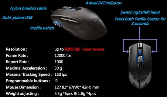 Krypton имеет симметричный дизайн; вес можно тонко настроить при помощи десяти симметрично расположенных грузиков разной массы. Предельная чувствительность мыши — 8200 dpi. Для настройки девяти программируемых кнопок доступно пять режимов. Их цветовую индикацию можно настроить. За изменение параметров отвечает утилита GHOST Macro Engine — та же, что и в клавиатуре.